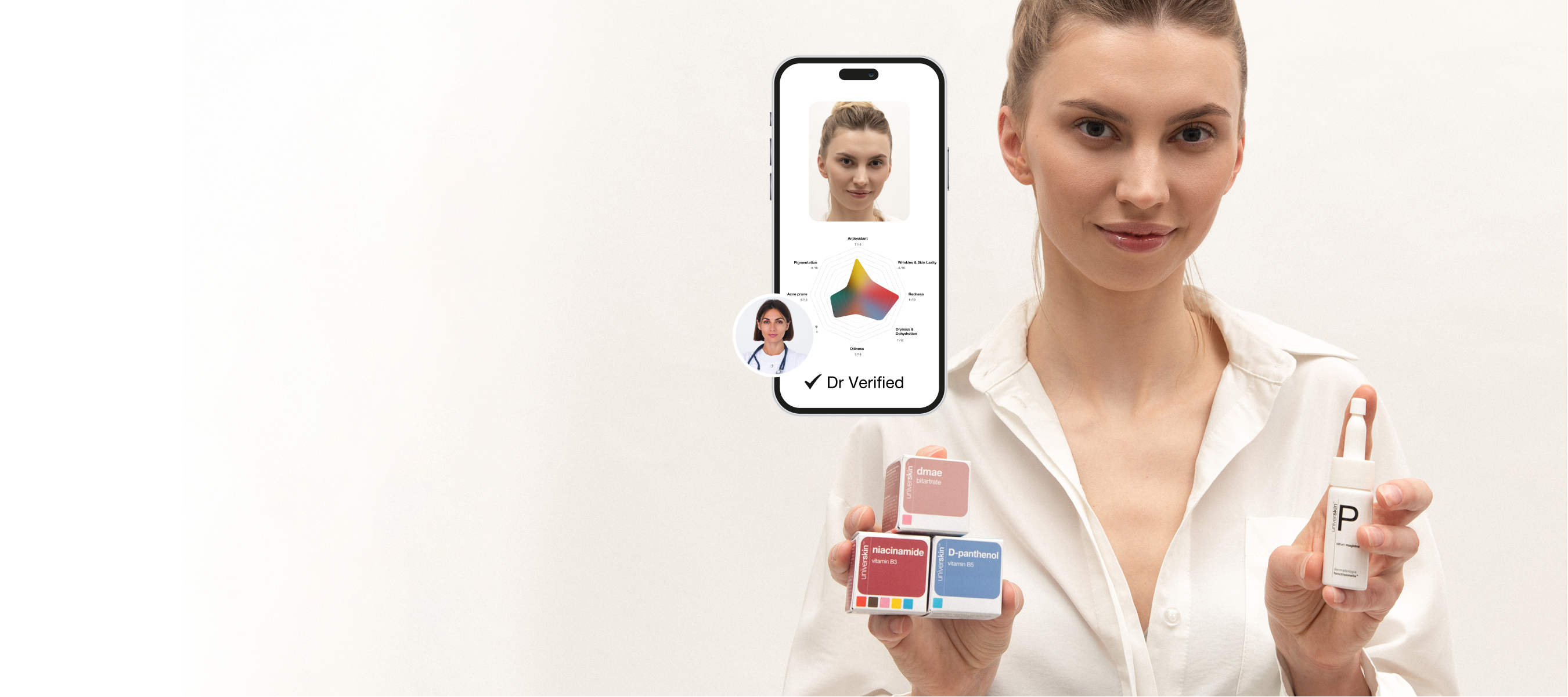 Nella seconda fase, un dermatologo qualificato ed esperto esamina i risultati dell'analisi della pelle. Preparano un piano di cura della pelle personalizzato su misura per i tuoi problemi specifici della pelle, composto da sieri in cui Universkin aggiungerà, su misura e nella concentrazione ottimale per le tue esigenze individuali, principi attivi rigorosamente selezionati noti per la loro efficacia e purezza.